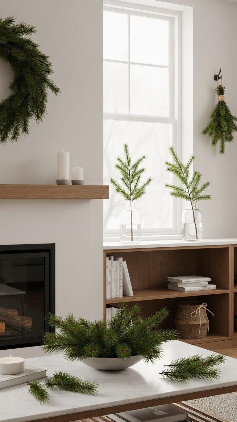 Bring in winter greenery to instantly freshen a room and anchor your seasonal styling. Use a simple pine centerpiece on the coffee table and place evergreen wreaths on doors or above mantels. You’ll keep lines clean: single sprigs in glass vases, short clippings on bookshelves, and small bundles on hooks. It feels modern, liberated, and effortlessly cozy.