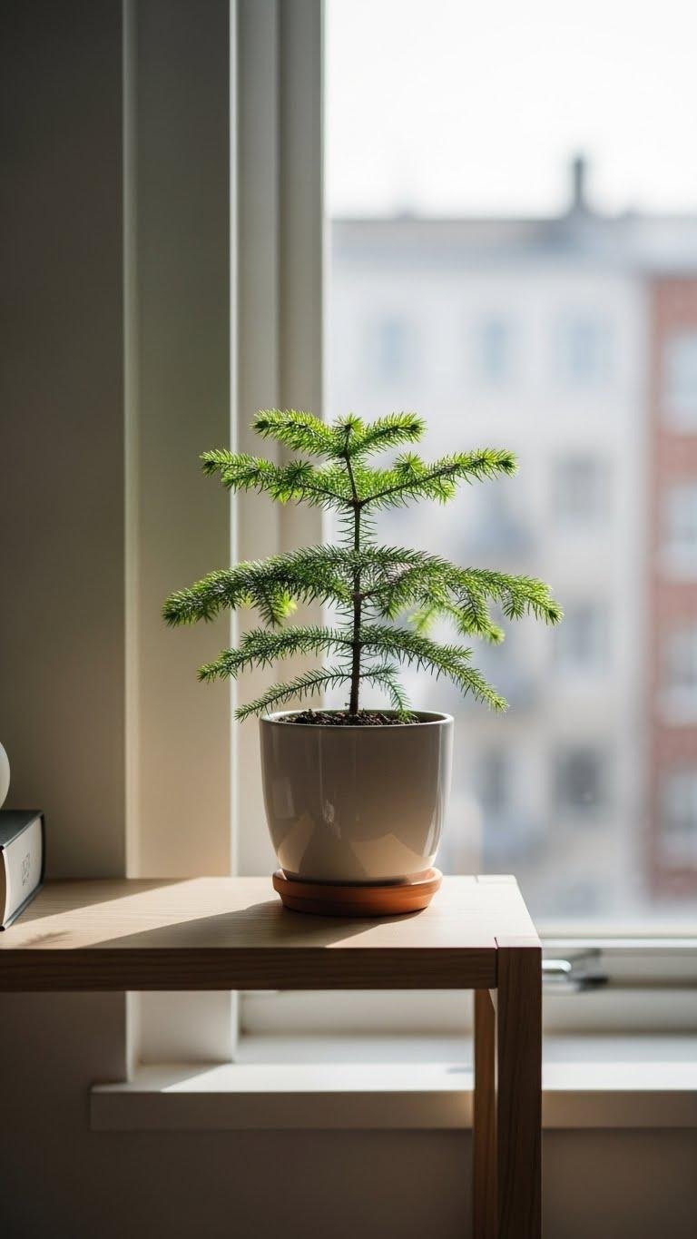 Tuck a small potted evergreen or Norfolk pine on a windowsill or console to introduce living texture and year-round green without overwhelming a minimalist scheme. Choose sculptural tabletop pines or compact miniature firs in simple pots, then rotate placements to keep the view fresh.