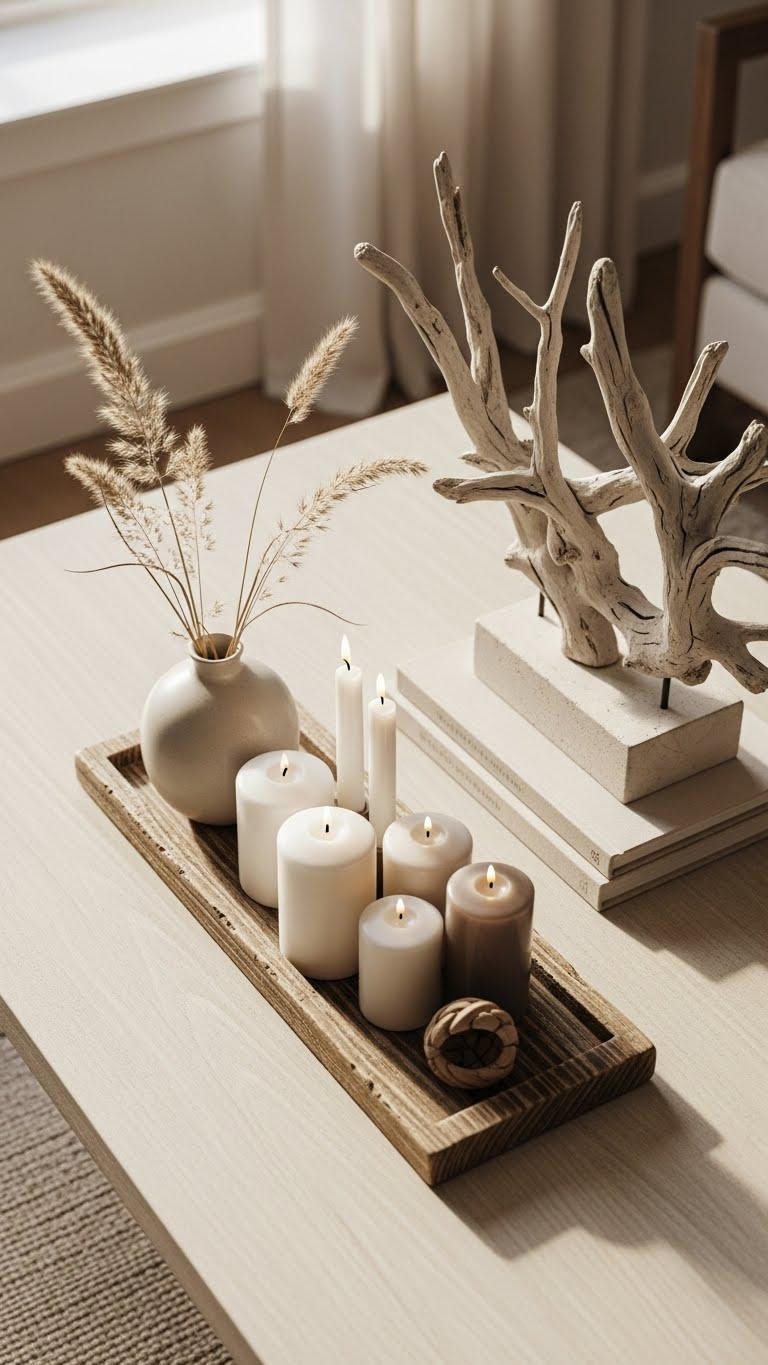 Wood-and-driftwood accents ground a winter palette with warm, tactile contrast—slide a slim wooden tray onto your coffee table or console to corral candles, a small vase, and a book, and layer a bleached driftwood piece for sculptural interest. Choose reclaimed wood trays for texture, mix coastal textures with matte ceramics, and let the arrangement feel effortless, free, and quietly curated.