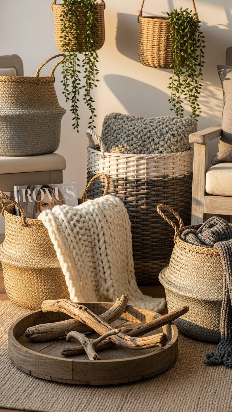 You’ll stash chunky throws, magazines, and extras in woven baskets that read like sculptural wicker art.