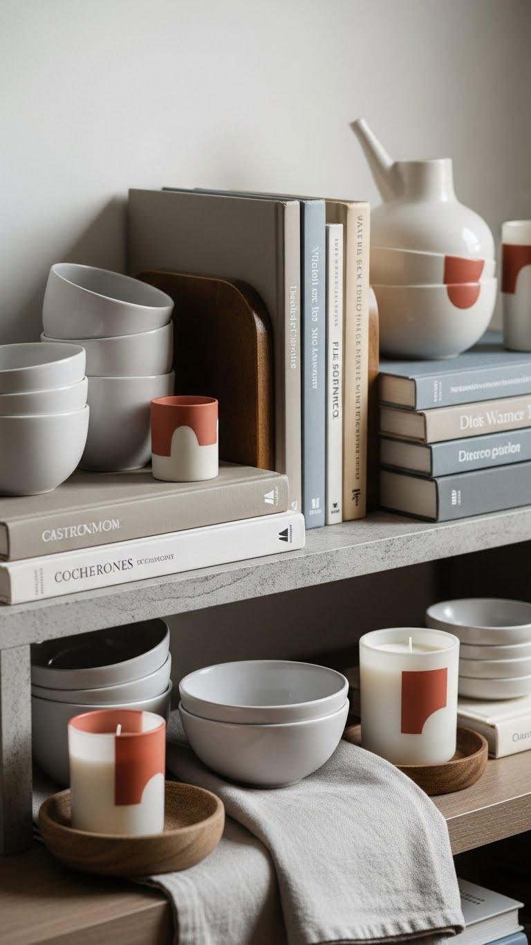 When you group ceramics, books, and small decor by a tight palette, the whole vignette reads as intentional rather than cluttered. Pick monochrome ceramics and muted spines, anchor stacks with vintage bookends, and repeat one accent hue across pieces. You’ll create calm cohesion that feels curated, not constraining — a small, liberated statement that makes winter corners look edited and inviting.