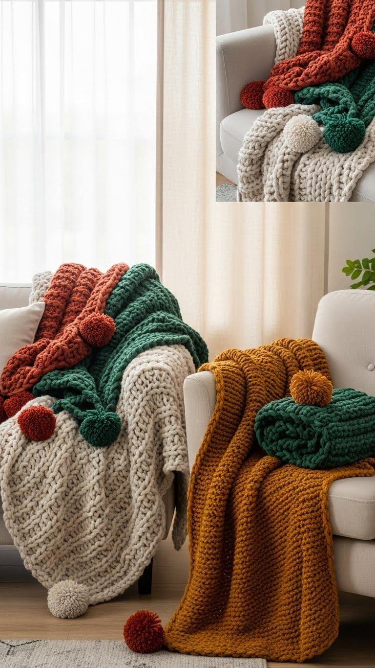Drape a chunky knit throw over your sofa or armchair to instantly add texture, warmth, and a touch of curated coziness. Layer a neutral base with a bold seasonal colorways topper, fold casually for relaxed freedom, and anchor with a handmade pom poms edge for playful detail. Let proportions vary—oversized for lounging, compact for sculpted style—so your space feels intentional and lived-in.