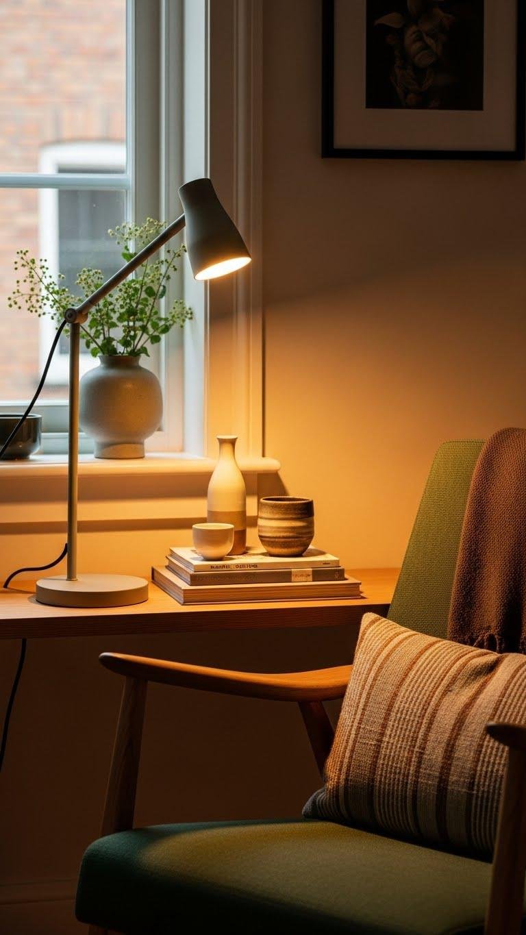 After you’ve curated a calm vignette with matched ceramics and books, add focused light to make those moments livable. Place task lamps by reading chairs and window nooks so you can linger. Choose an adjustable gooseneck fixture with a gooseneck dimmer for precise, mood-flexible beams. Keep finishes minimal and cords tidy to preserve a liberated, intentional aesthetic that invites long, cozy evenings.