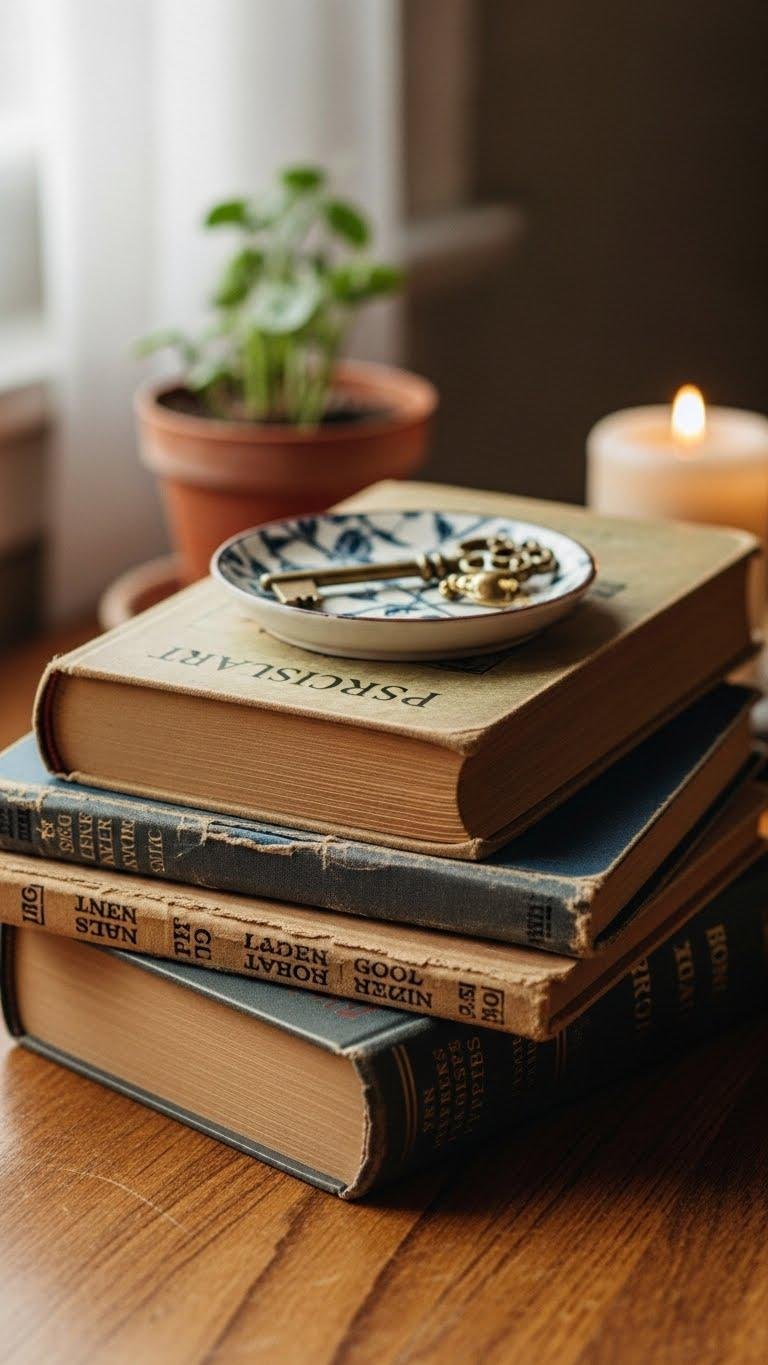 Pull together a small vignette by stacking books and styling a few meaningful objects on top to create an artful, lived-in moment. You’ll use vintage paperbacks, curated keepsakes and a simple ceramic dish to balance height and texture. Mix worn covers with a small plant or candle, keeping compositions loose and personal. Let each stack feel intentional, free, and effortless.