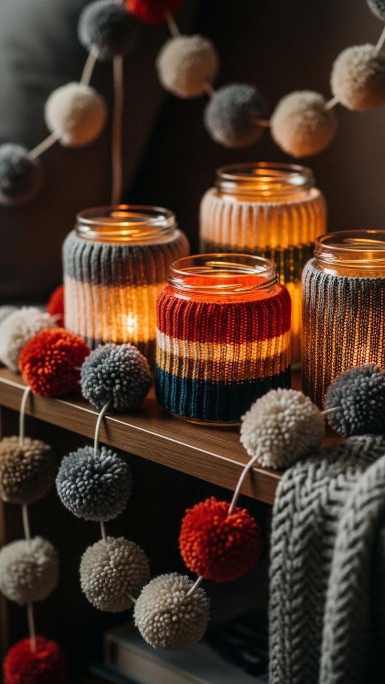 Cozy up plain jars and banish seasonal sameness with sweater-wrapped jars and pom-pom garlands that bring instant texture and personality to your winter vignette. You’ll grab old sweaters, cut strips, and secure them around jars for cozy candlelight; try diy sweater jars for bedside or shelf accents. Explore pompom garland making with neutral tones or bold pops to express your free, layered style.