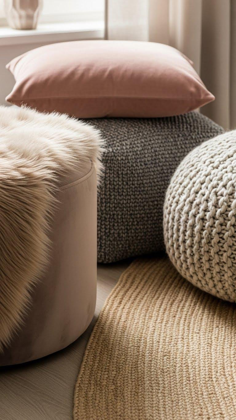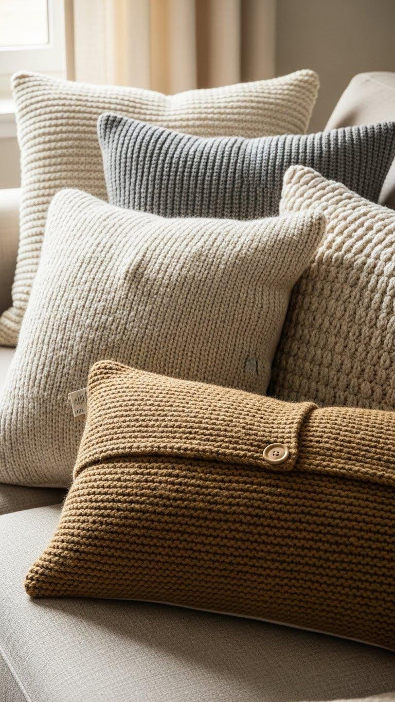You’ve layered throws—now bring that same tactile warmth down to eye level with sweater-knit or bouclé pillows. Choose neutral, sculptural shapes that invite touch; mix hand stitched pillows with chunky textures for artisanal contrast. Add a few button closure cushions to keep a tailored look while staying cozy.