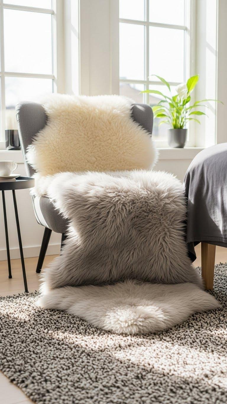 Often a small swipe of sheepskin or faux-fur instantly softens a room, so tuck one by a chair, bedside, or entry to add tactile warmth and luxe texture.