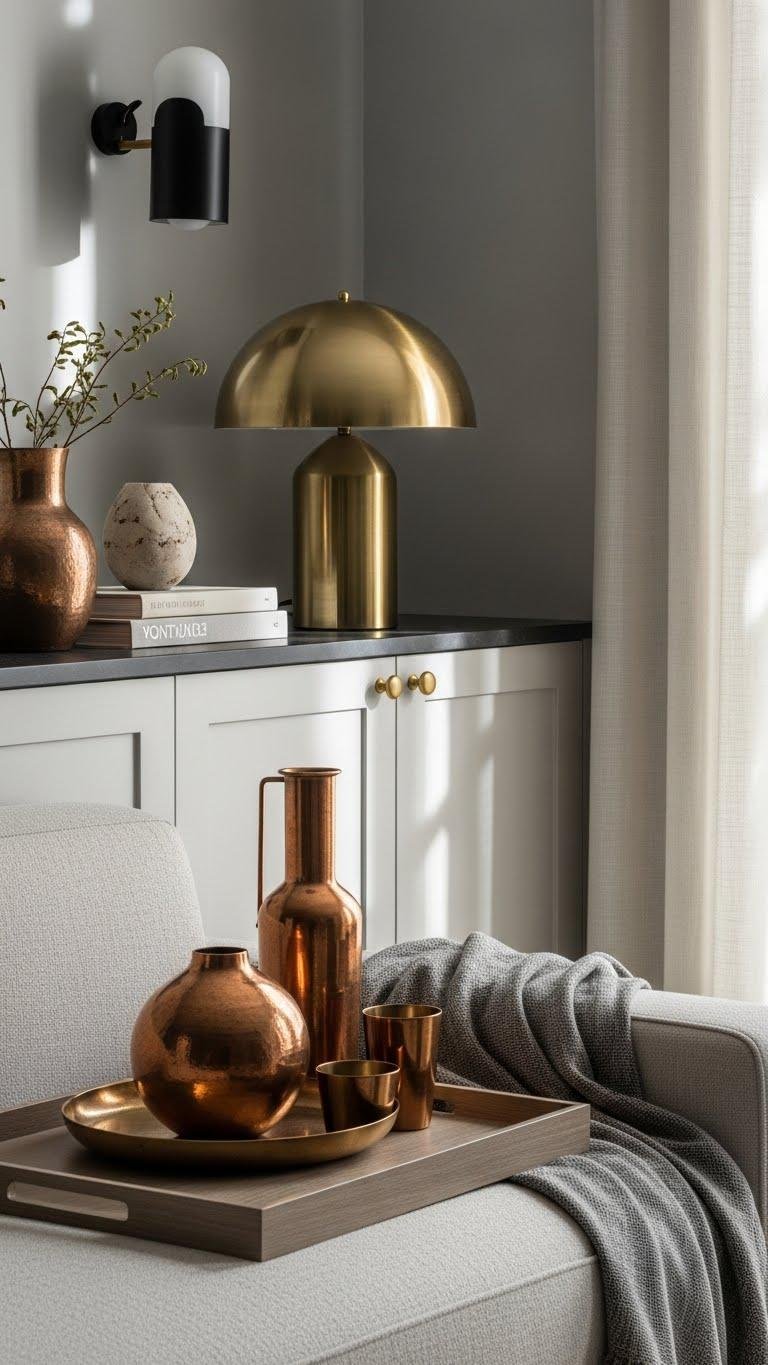 You’ll layer brass warmth through hardware, lamps, and frames, then introduce subtle copper highlights with vases or trays.