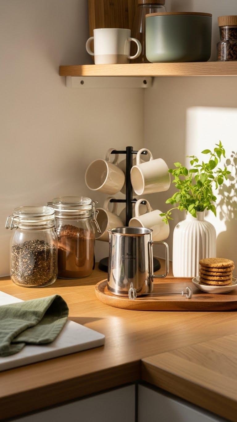 Carve out a small corner and turn it into a dedicated hot chocolate or tea station that feels both intentional and effortless. You’ll arrange a sleek mug display, canisters of cocoa, loose leaf tea, and a frother on a tray. Add minimalist seasonal signage for vibe and rotate herbs or biscuits. Keep surfaces tidy, colors warm, and tools accessible so you can relax and roam.