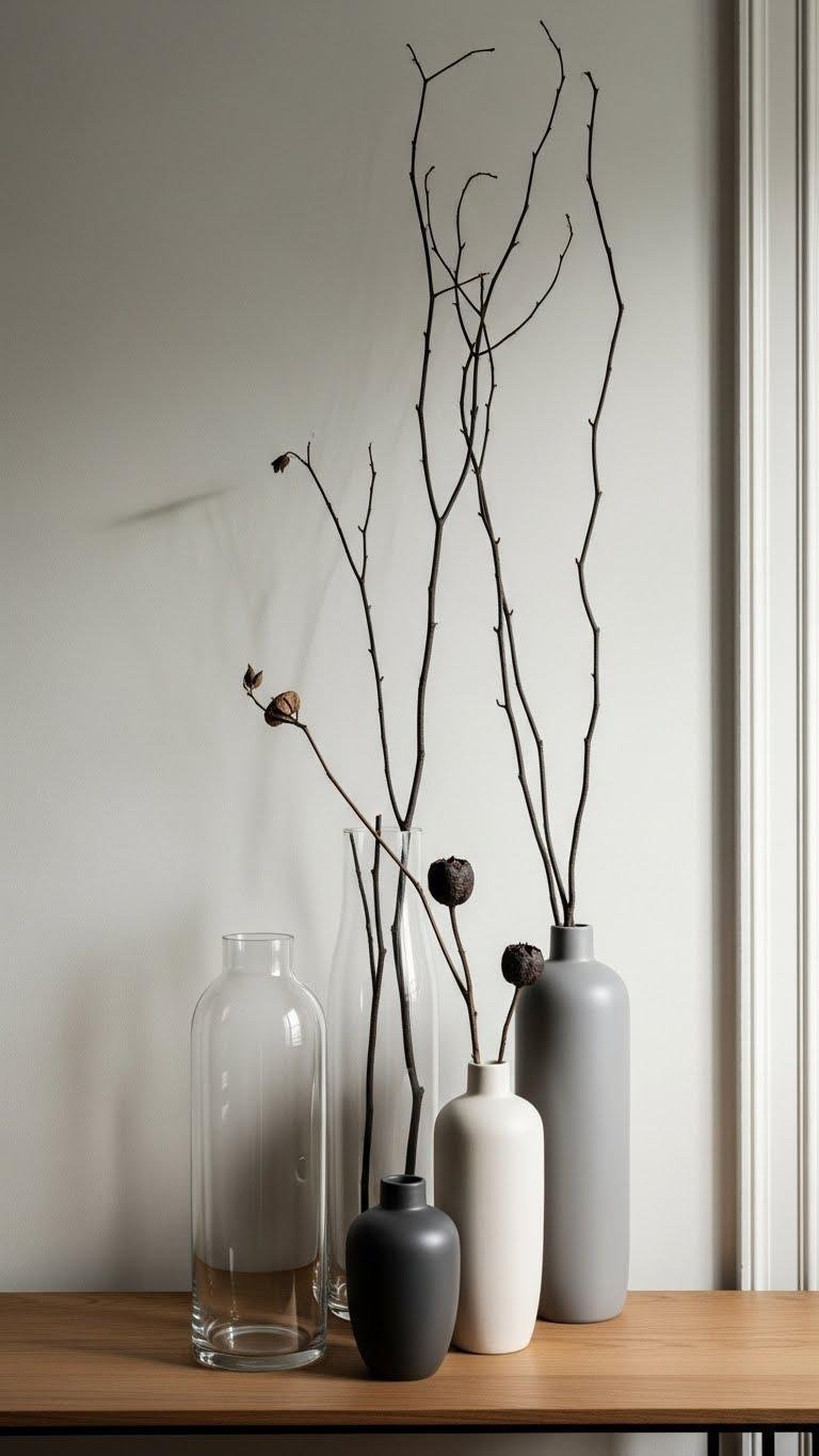 After the soft sculptural line of birch logs, bring the eye upward with bare branches tucked into tall vases to add vertical calm and graphic simplicity. Let sculptural twigs punctuate corners, their silhouettes bold against light. Add scatterings of dried seedpods for texture and surprise. You’ll cultivate a liberated, minimalist warmth that feels intentional, modern, and quietly brave.