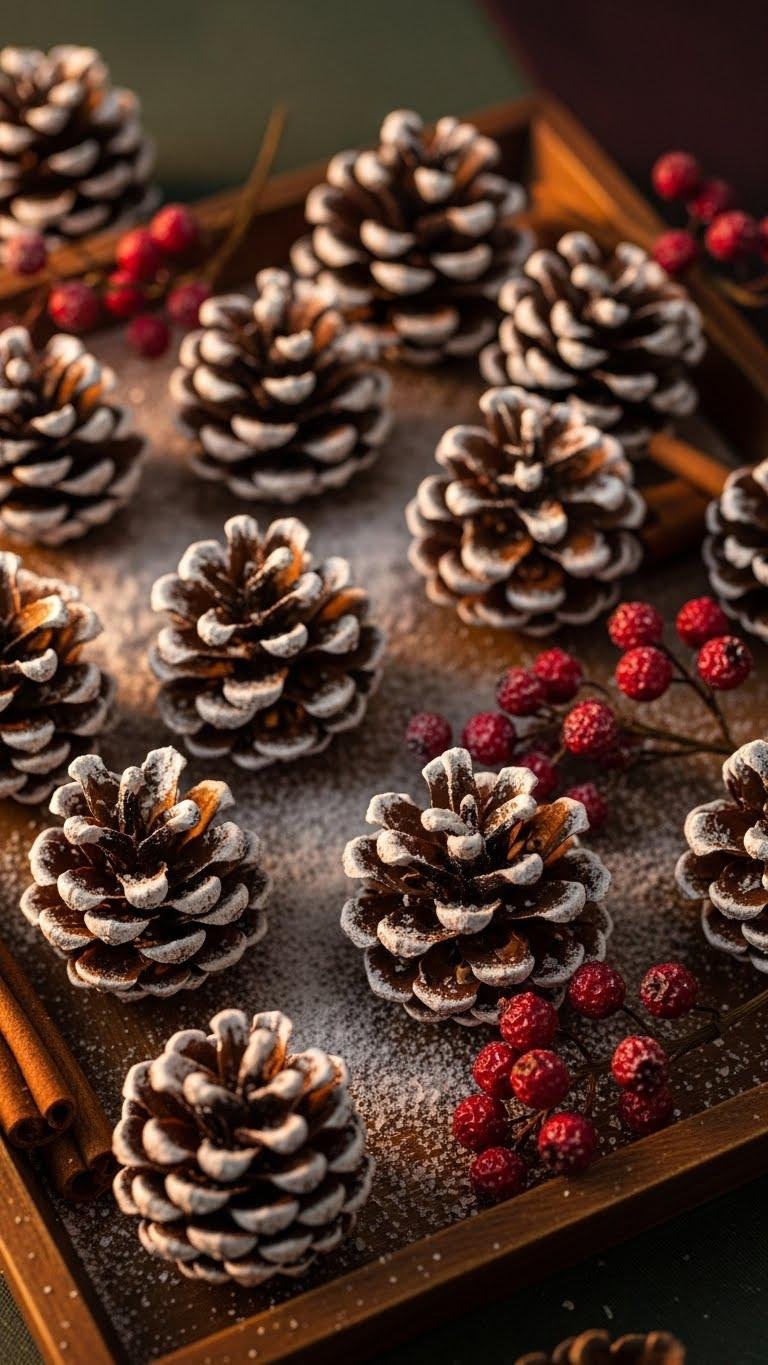 Scatter a handful of pinecones across a tray and watch them turn into a tiny winter tableau — their scales picked out with a whisper of faux snow that catches the light and reads like frost at a glance. You’ll tuck in dried berry accents and a few cinnamon sticks for warmth, arranging freely so each cone breathes, inviting you to linger and savor a simple, liberated season.