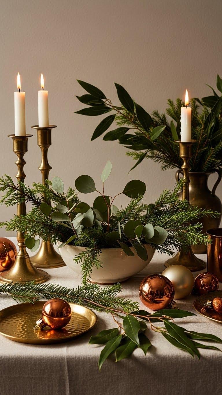 Introduce warm metals—brass, aged gold, and burnished copper—to punctuate your winter palette, and let living greenery soften their glow. You’ll place aged brass candlesticks beside eucalyptus stems in a low bowl, drape evergreen sprigs over a mantle with Copper accents, and relish how metallic warmth and verdant texture evoke freedom, comfort, and intentional, unfussy seasonal style.
