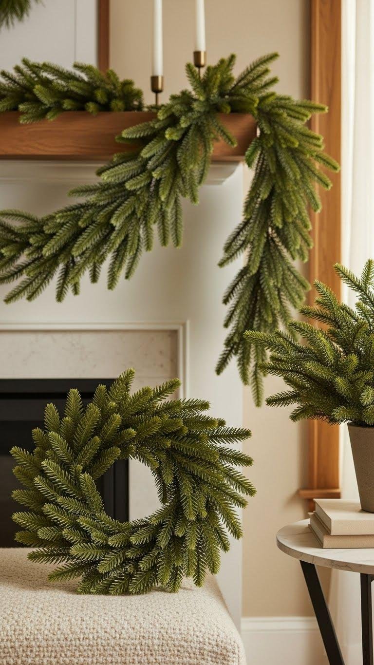 When you want the look of fresh evergreens without daily care, high-quality faux greenery gives you that effortless, lived-in feel—silky needles, varied tones, and subtle imperfections mimic real branches so closely guests will do a double take.