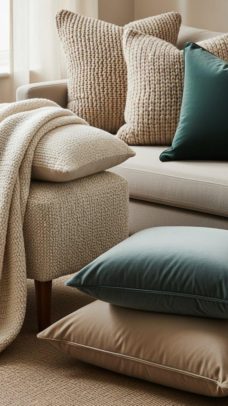 Layer up tactile interest by mixing pile heights and fabrics so every pillow invites a different kind of touch. You’ll combine a plush velvet lumbar with a low-pile wool square, a shaggy faux-fur accent, and a breezy linen toss to balance weight and airiness.